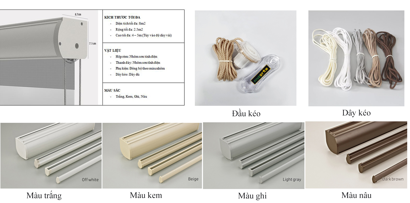Hộp phụ kiện của rèm cầu vồng FIVESTAR thường là hợp kim nhôm được phủ sơn tĩnh điện cao cấp, có tuổi thọ lâu bền. Thông thường các hộp phụ kiện sẽ được lựa chọn màu sắc đồng bộ với màu sắc vải để tạo nên vẻ đẹp hài hòa cho bộ rèm.